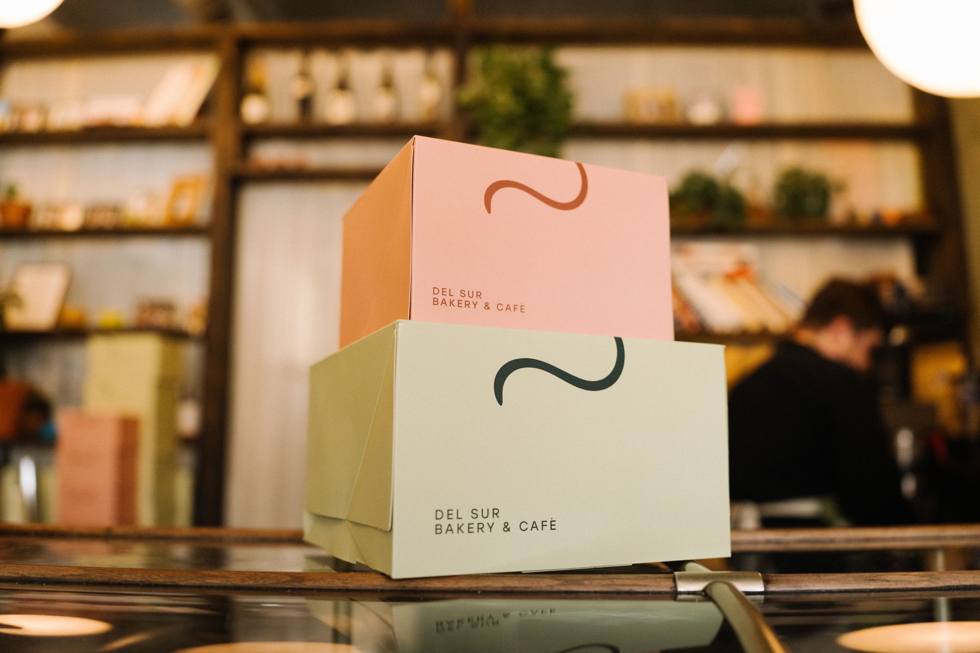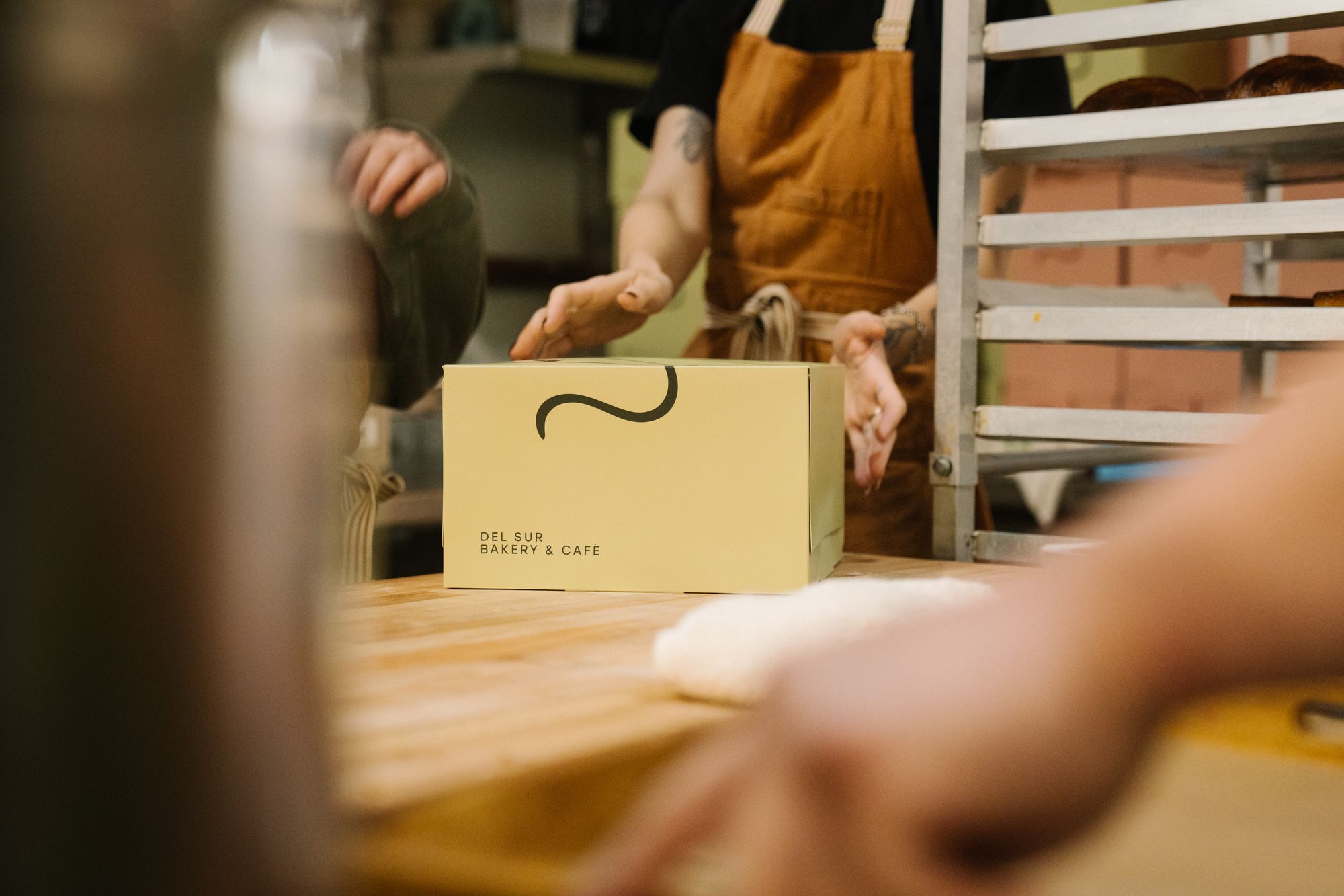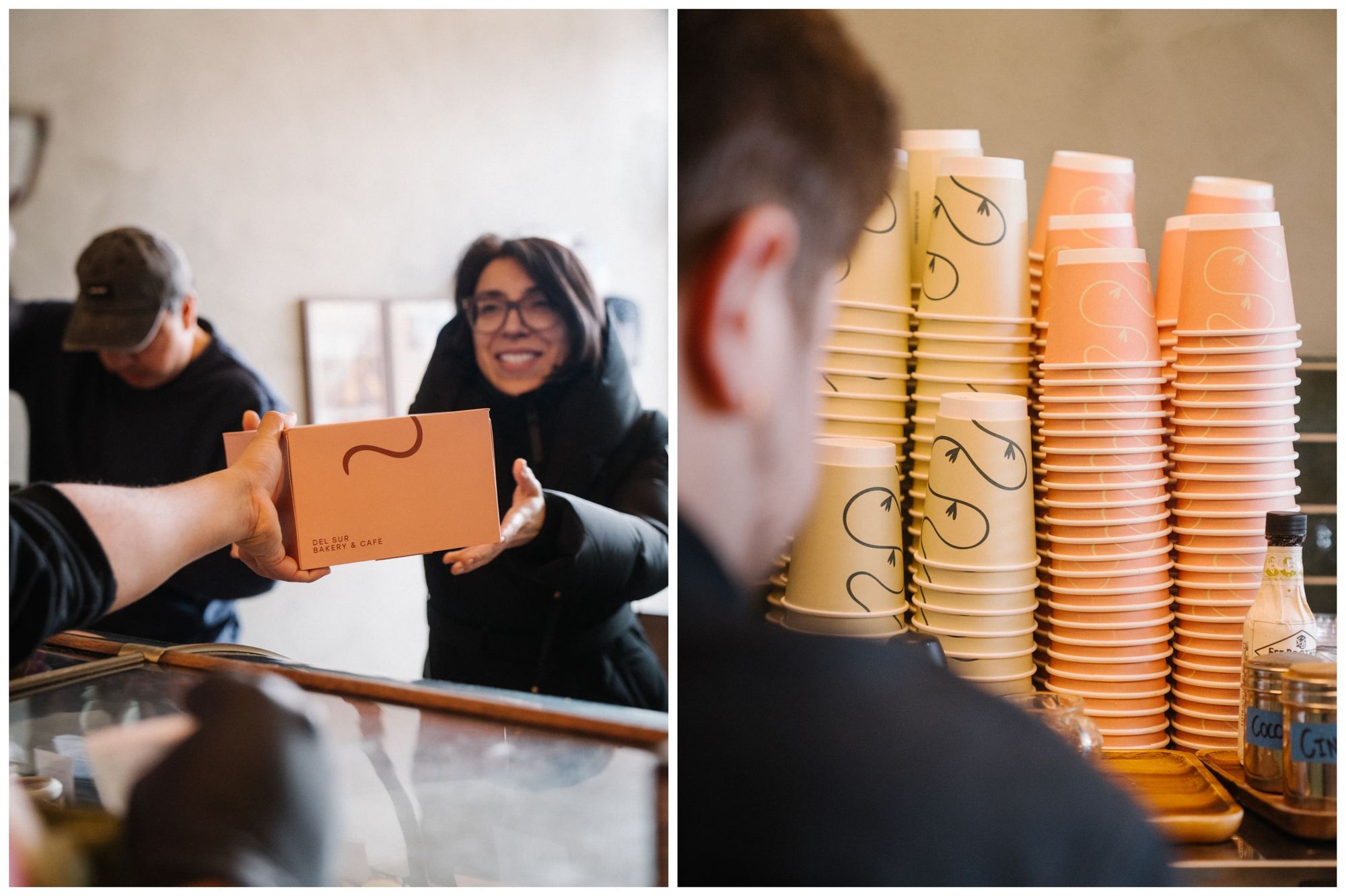 Stacks of pastry boxes line the walls, printed and folded, ready for the morning rush. The packaging has become its own small phenomenon. Customers send Lerias photos of strangers carrying Del Sur boxes around the neighborhood. The branding travels.