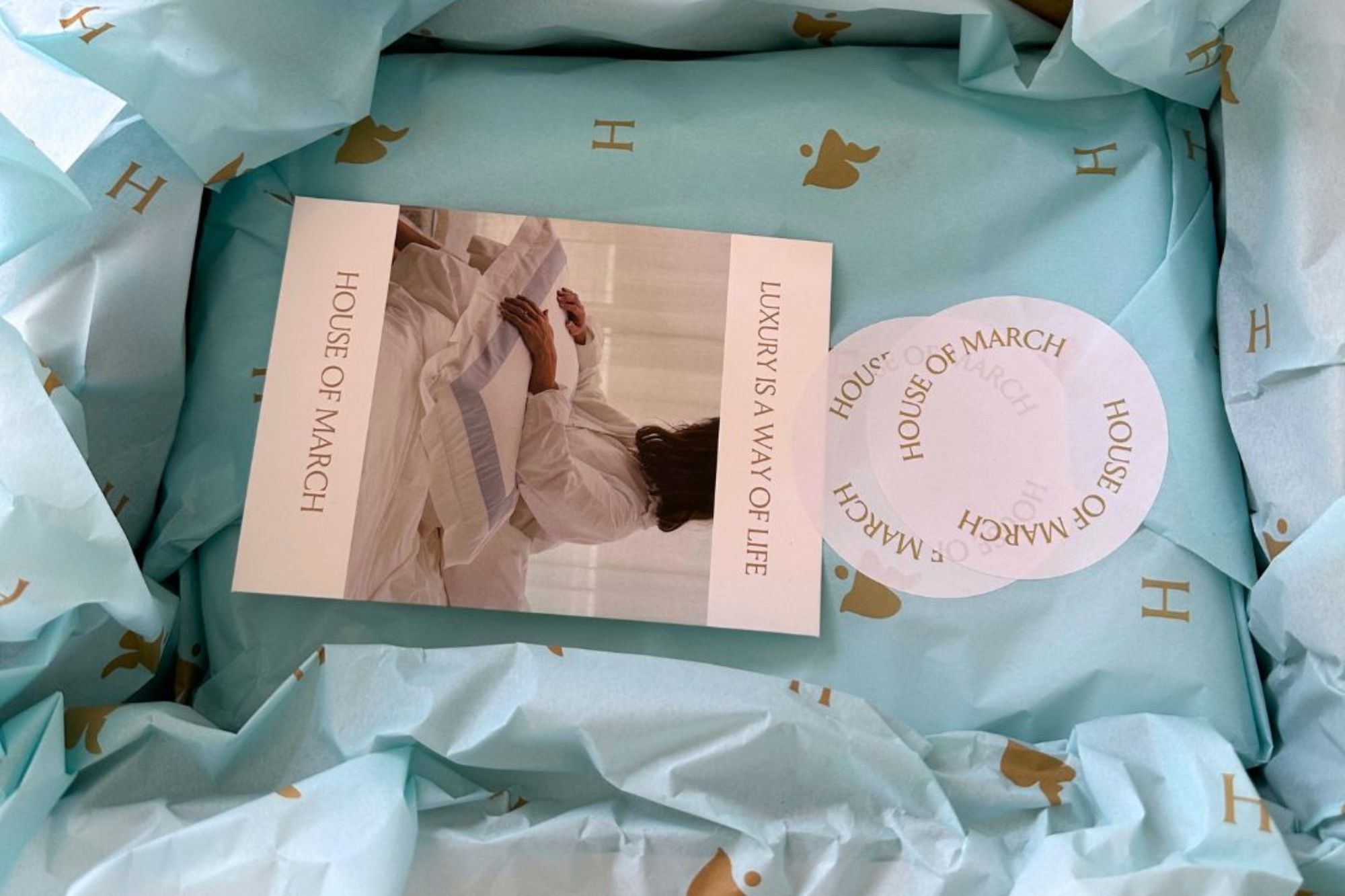 We ship our organic bed linens wrapped in our custom tissue paper, with a little hand written note, sealed with our stickers, and in our custom House of March box.